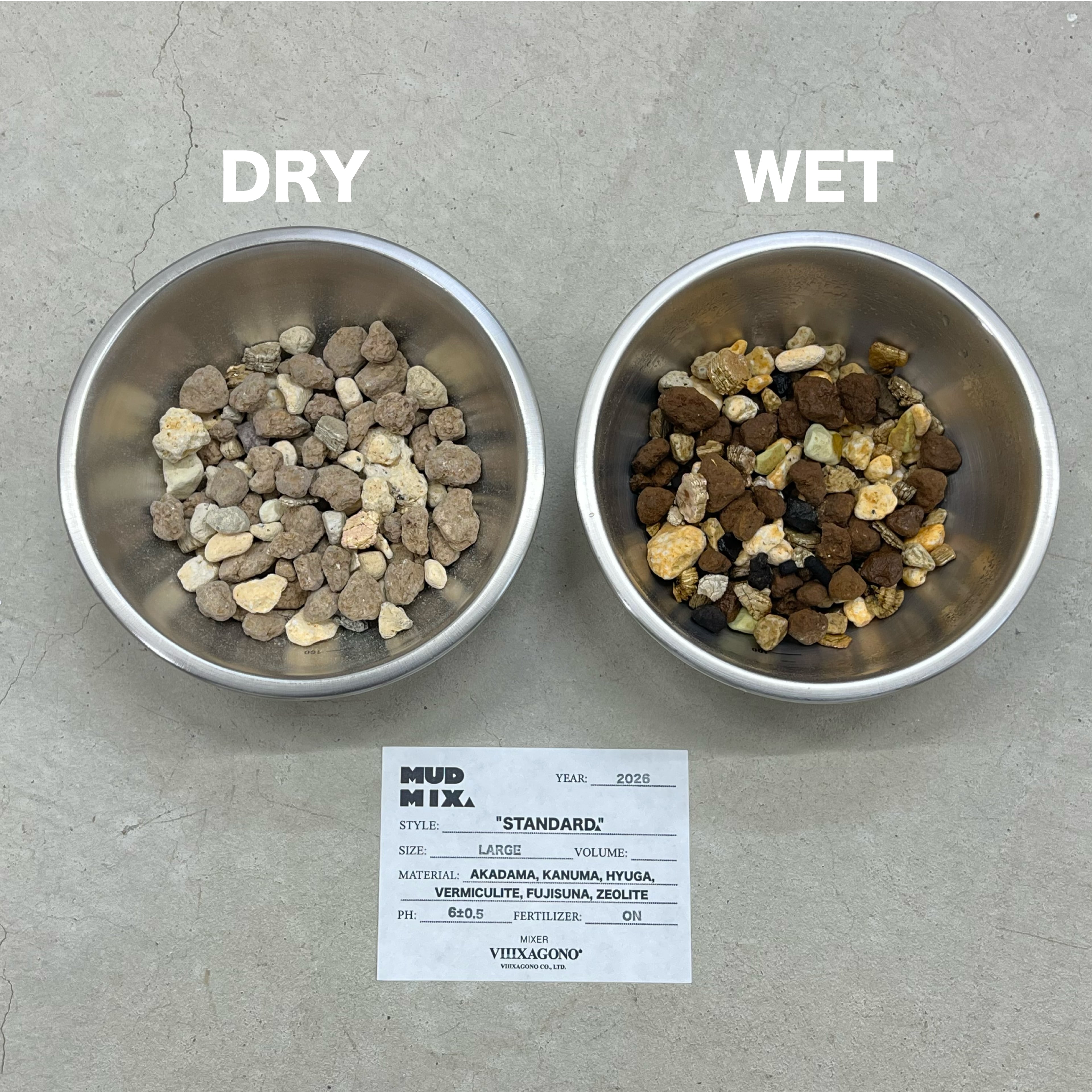 ※写真のステレンスボウルに入っている用土は乾燥状態と水で濡れた状態の比較画像です。