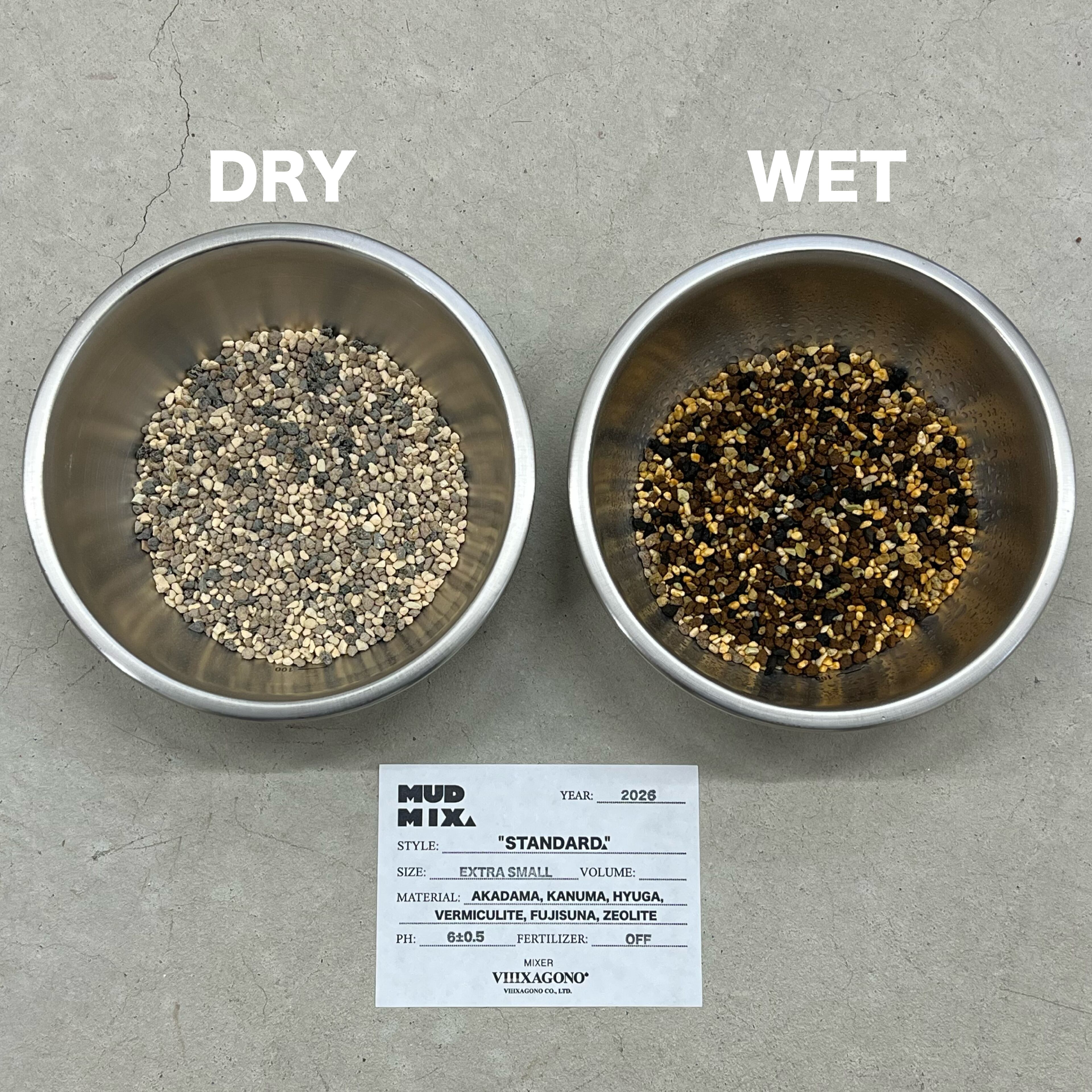 ※写真のステレンスボウルに入っている用土は乾燥状態と水で濡れた状態の比較画像です。