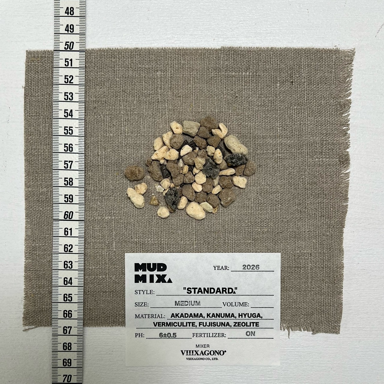 原料: 赤玉土(茨城県中部産), 鹿沼土(鹿沼市北部産), 日向土(宮崎県産), バーミキュライト, 富士砂, ゼオライト